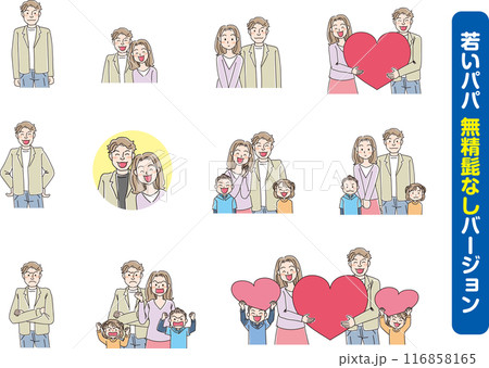 人物イラスト_4人家族_小学生男女とママと無精髭なしパパ