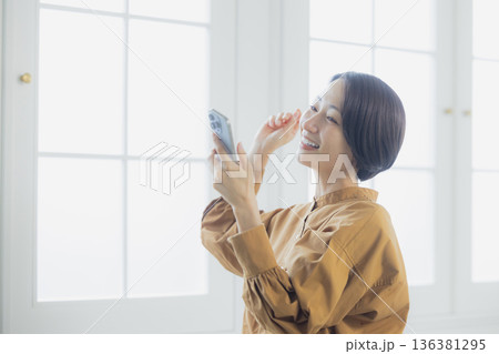 部屋で通販の荷物を確認をする女性のライフスタイルイメージ