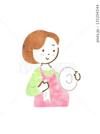 お皿を拭くエプロン姿の妊婦さんのイラスト