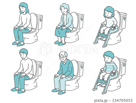 トイレに座る人々のイラストセット(全世代・男女・子供・快便・リラックス)