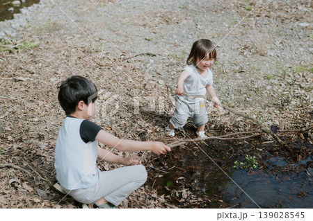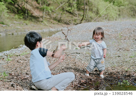川原で遊ぶ兄弟