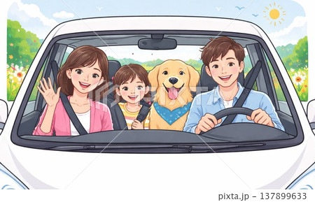 家族でドライブを楽しむ車内の楽しいお出かけシーン
