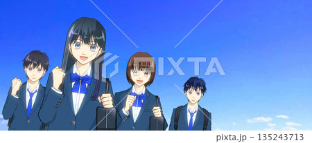 広がる青空、リュックとスクールバッグを持つ高校生または中学生の男女のアニメ風イラスト