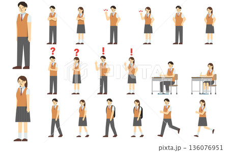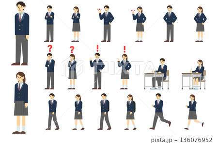 制服姿の男女の学生の全身イラストセット・様々なポーズと表情(ガッツポーズ、考える、悩む)