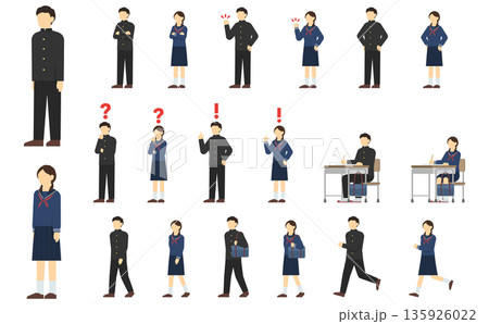 中学生や高校生のイメージイラスト 制服を着た学生のシンプルでフラットなイラストセット