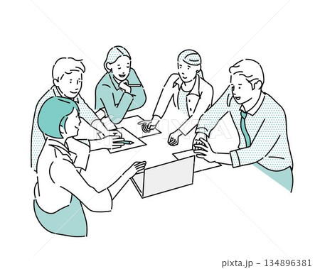 線画のノートパソコンと資料がある会議のビジネスチームのイラスト