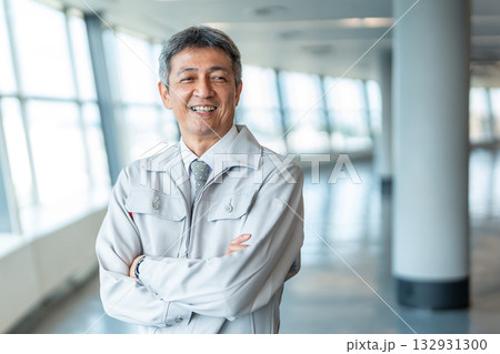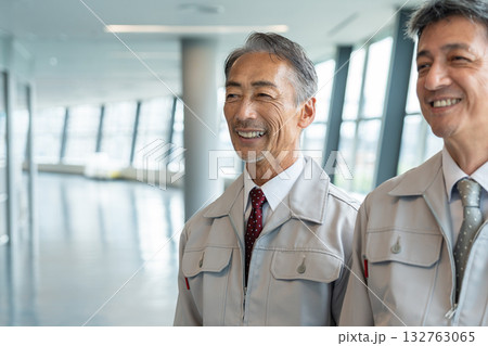 オフィスのロビーに立つ作業着を着たシニアの男性