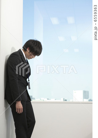 寄り掛かってうなだれるスーツ姿の若い男性