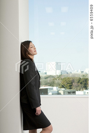 壁に寄り掛かるスーツ姿の若い女性