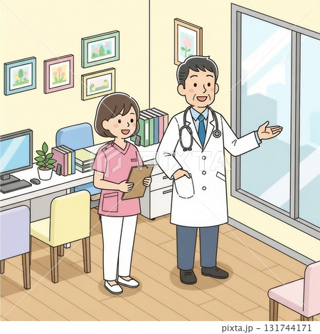 優しい色合いで描いた介護士と介護福祉士と医者(医療関係者)