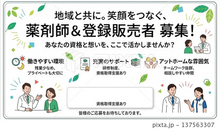 薬剤師・登録販売者募集ポスター 地域を笑顔にする薬局求人採用テンプレートイラスト