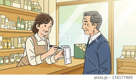 薬局で薬を受け取る男性と薬剤師の笑顔のやり取り