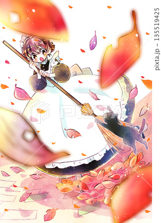 ほうきを持っているメイドさんと飛びかかる猫 落ち葉 庭 沢山