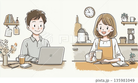 自宅でテレワークをするカップル