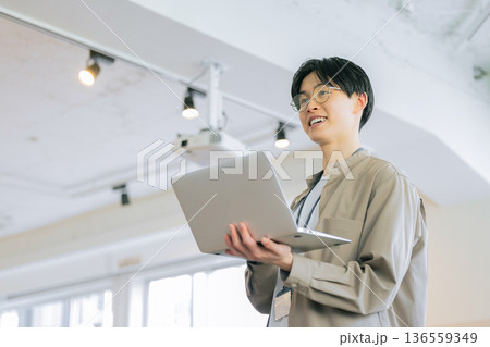 オフィスでノートパソコンを持って歩くビジネスウーマン