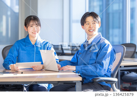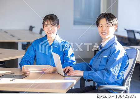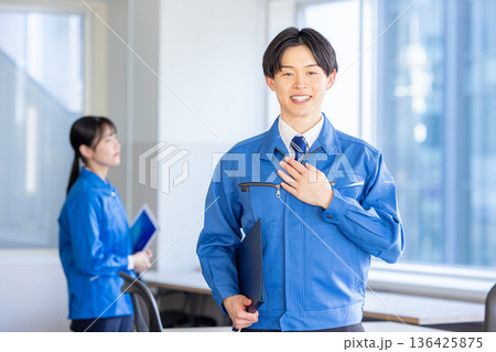 工場・工務店などの中小企業で働く作業着を着た従業員・スタッフ(ビジネスマン・ビジネスウーマン)