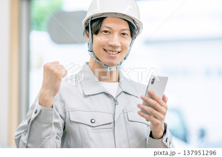 作業服を着た男性がスマホを持っている