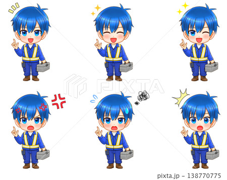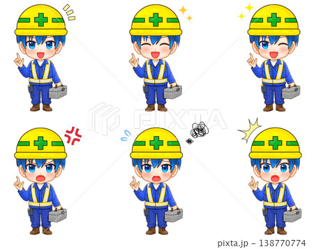 ヘルメットをした建設会社の男性社員のちびキャライラスト素材セット