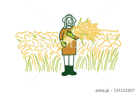 収穫した稲穂を持つおじいさん農家さん、農業、農業をする男性のイラスト素材