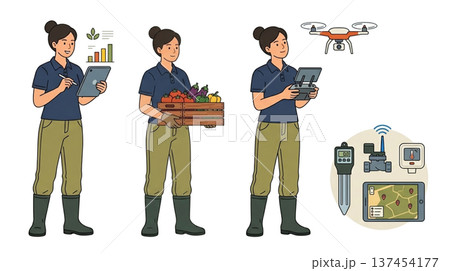 スマート農業・女性農家イラストセット(タブレット・ドローン・収穫・IoTセンサー)