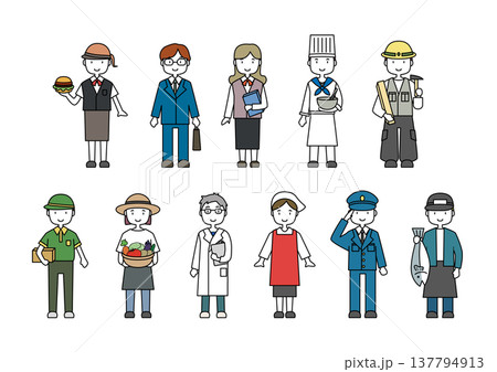 ホテル業界・建設現場・医療・警察・飲食業など幅広い職業で活躍する男女。シンプルでおしゃれな素材。