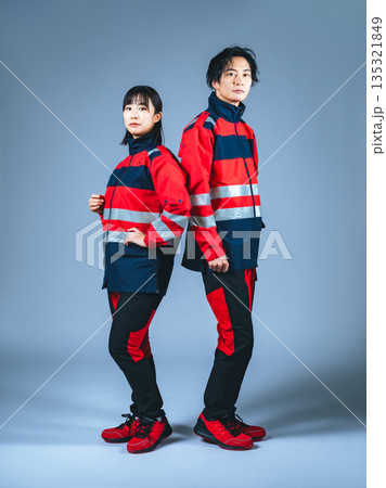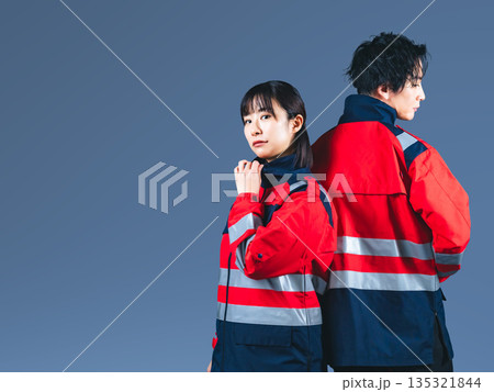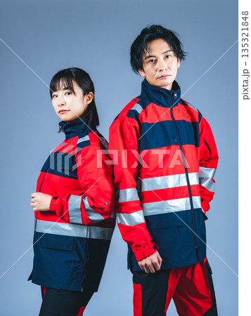 ユニフォームを着た男女の全身写真