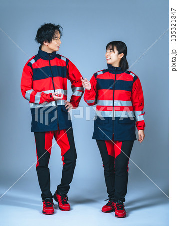 会話するユニフォームを着た男女の全身写真
