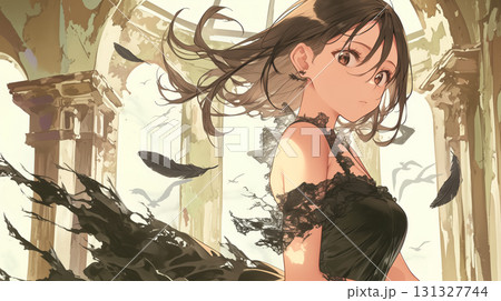 黒いドレスの少女と廃墟の羽根