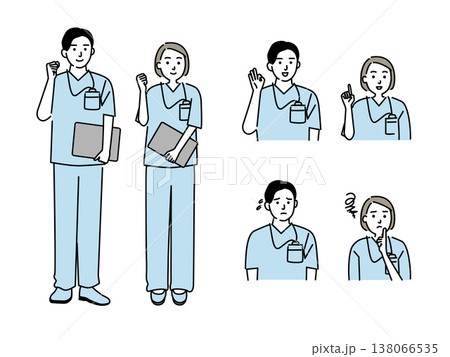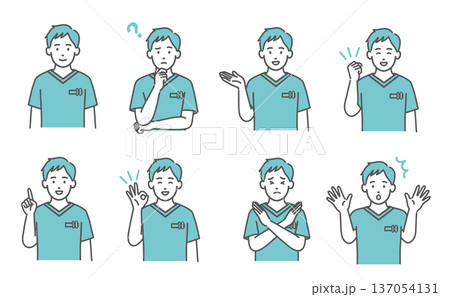 スクラブ姿の男性医療従事者の表情・ポーズイラストセット(上半身・8種類)
