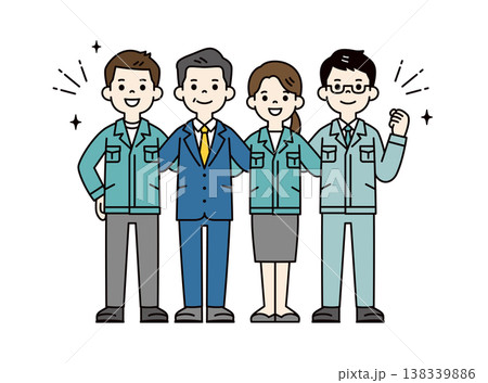 チームで肩を組む、工場の社長・経営者・作業員・従業員・事務員の全身ベクターイラスト素材