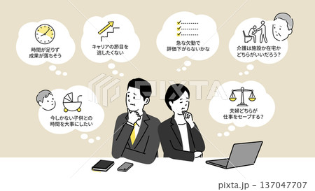 ダブルケアに悩む共働き夫婦の両立問題イメージイラスト 育児・介護・仕事のバランスに向き合う中年世代