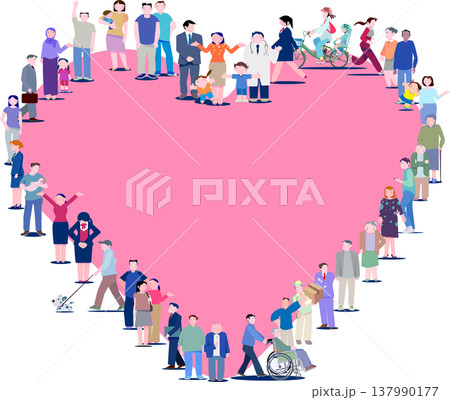 社会保障と福祉の多様な人々が集まるハートのフレームイラスト(ベクター・コピースペース・編集可能)