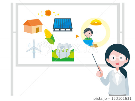 SDGs7 エネルギーをクリーンなものにする様子を説明している女性