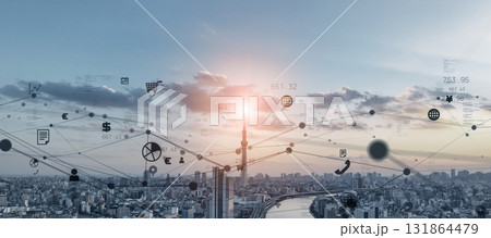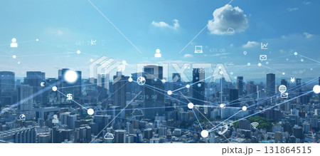 現代都市と通信ネットワークのコンセプトイメージ バナー・広告向け横長ビジュアル