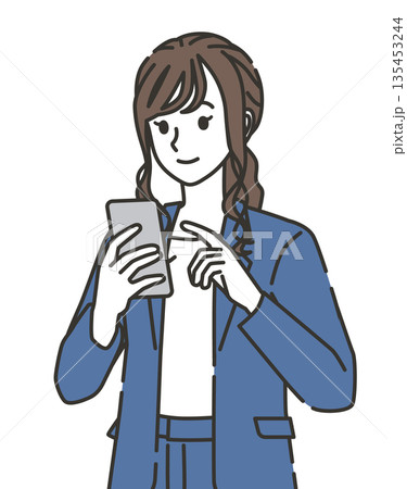 スマートフォンを操作する女性のイラスト、 ビジネスシーンでスマホを使う女性、 水彩風で描かれたスマホ