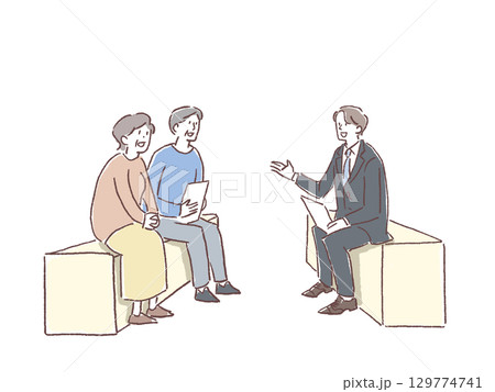 相談窓口で説明を受ける夫婦の線画イラスト素材