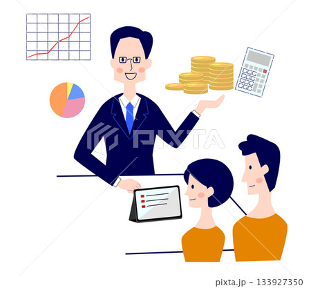 相談をする若い子連れの夫婦と説明をするスーツの男性のイラスト素材