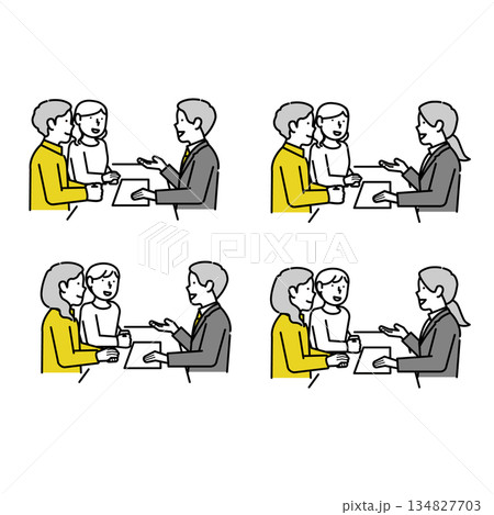 相談窓口で説明を受ける夫婦の線画イラスト素材