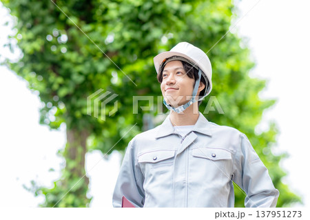ノートパソコンを持って仕事をする作業服姿の若い男性