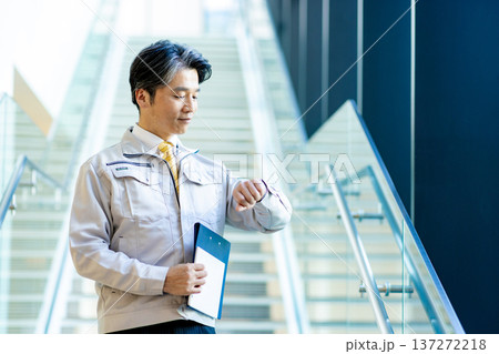 工具箱を持つ作業服のミドル男性ビジネスマン