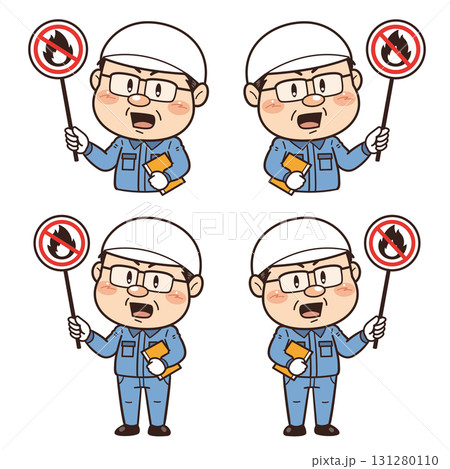【火気厳禁】工場や現場で働く男性作業員が禁止標識を持つイラスト|不安全行動・不安全状態・労働災害