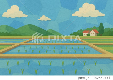 5月の田んぼ 田植え直後 田植え 里山風景 貼り絵調