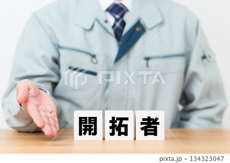 開拓者のブロックと作業着を着たミドル男性ビジネスマン