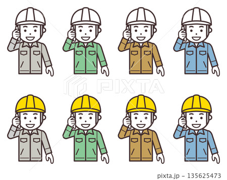 スマホで電話するヘルメットと作業服を着用した男性のアイコン