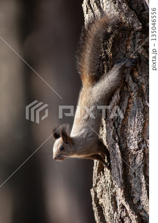 秋の森で忙しく走り回るエゾリス