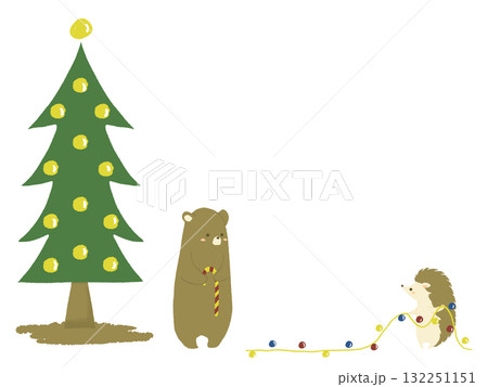 森でツリーの飾りつけをするクマとハリネズミのイラスト