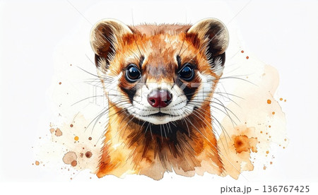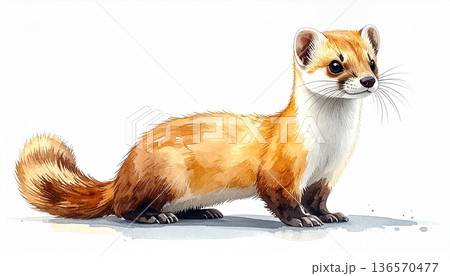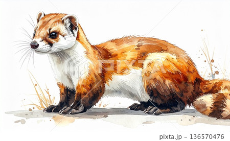 白背景に描かれた茶色のイタチの水彩画風イラストレーション。つぶらな瞳と長い尻尾の可愛い動物素材