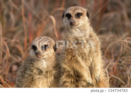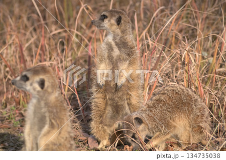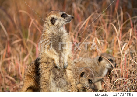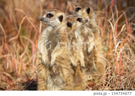 秋の夕陽を受けながら仲間の行動を見守るミーアキャット