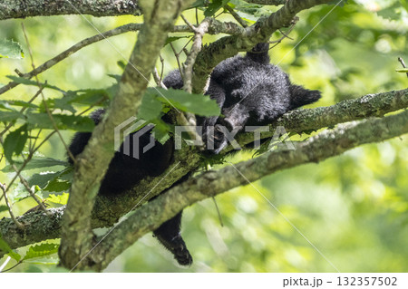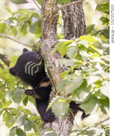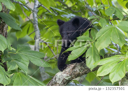 【北海道_ヒグマ】木登りする小熊 知床 10月