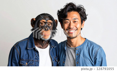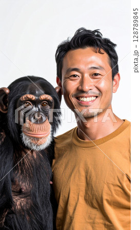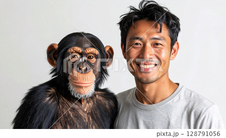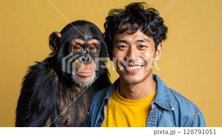 カメラ目線のチンパンジーと日本人男性(AI生成画像)